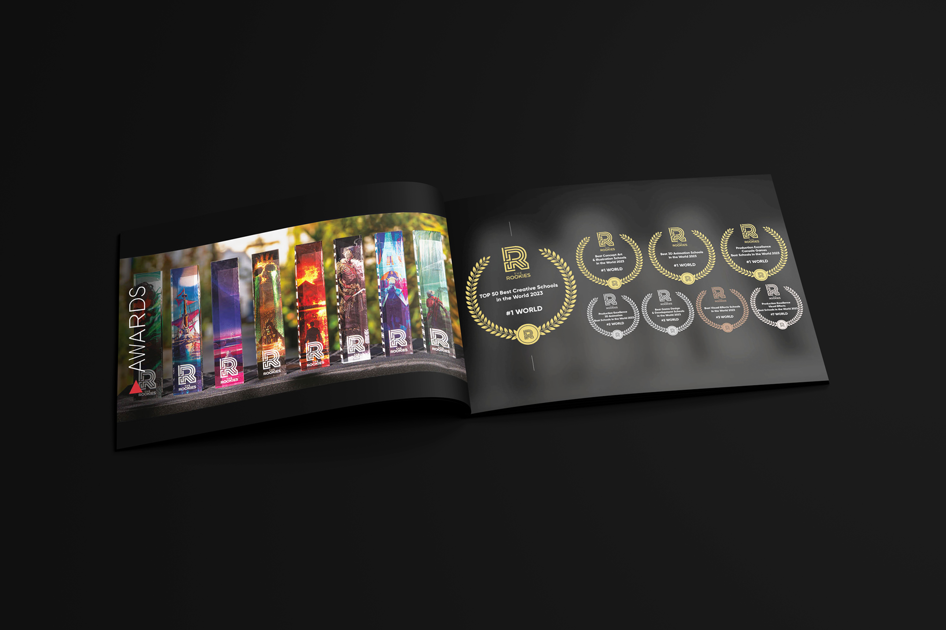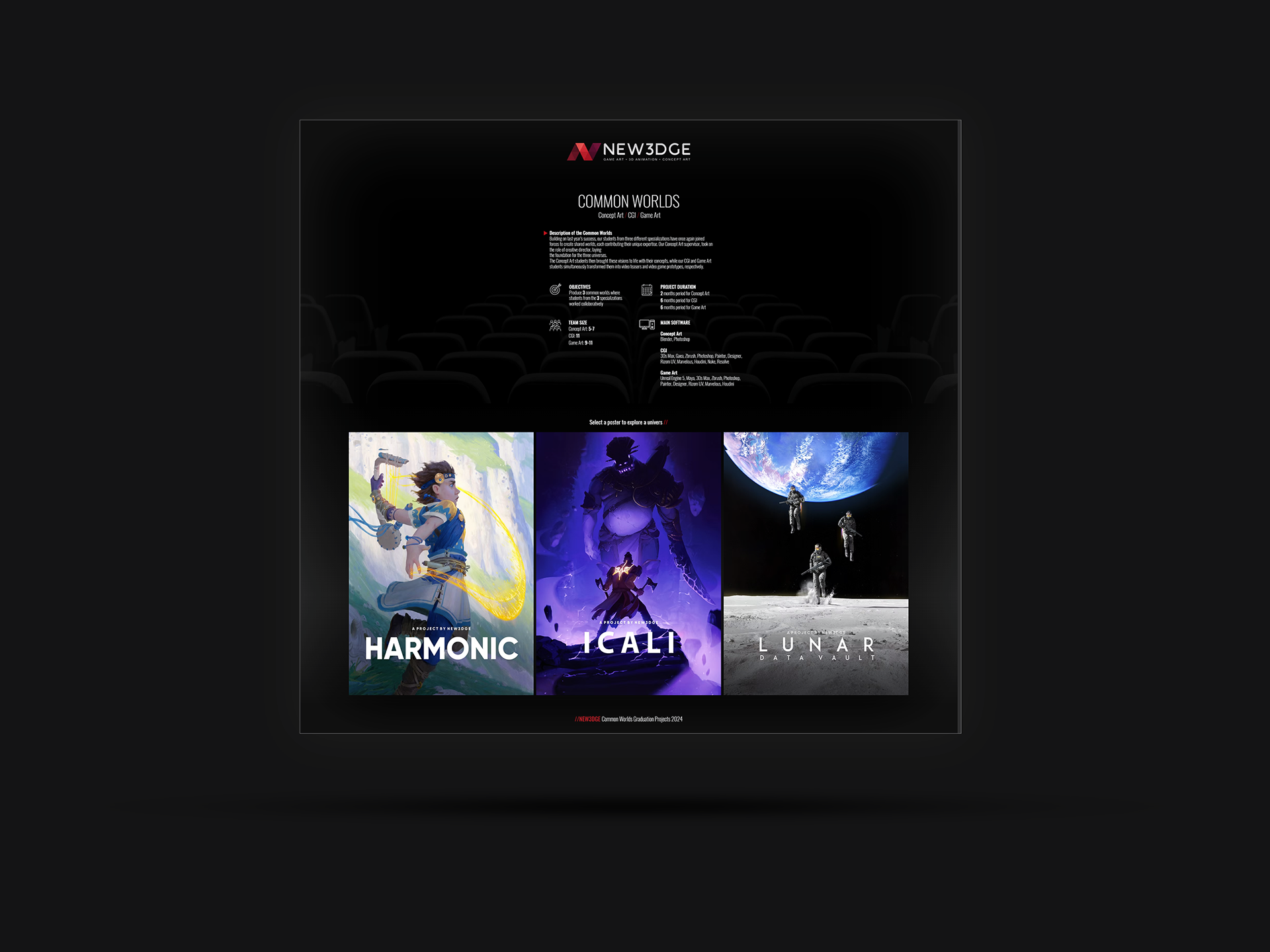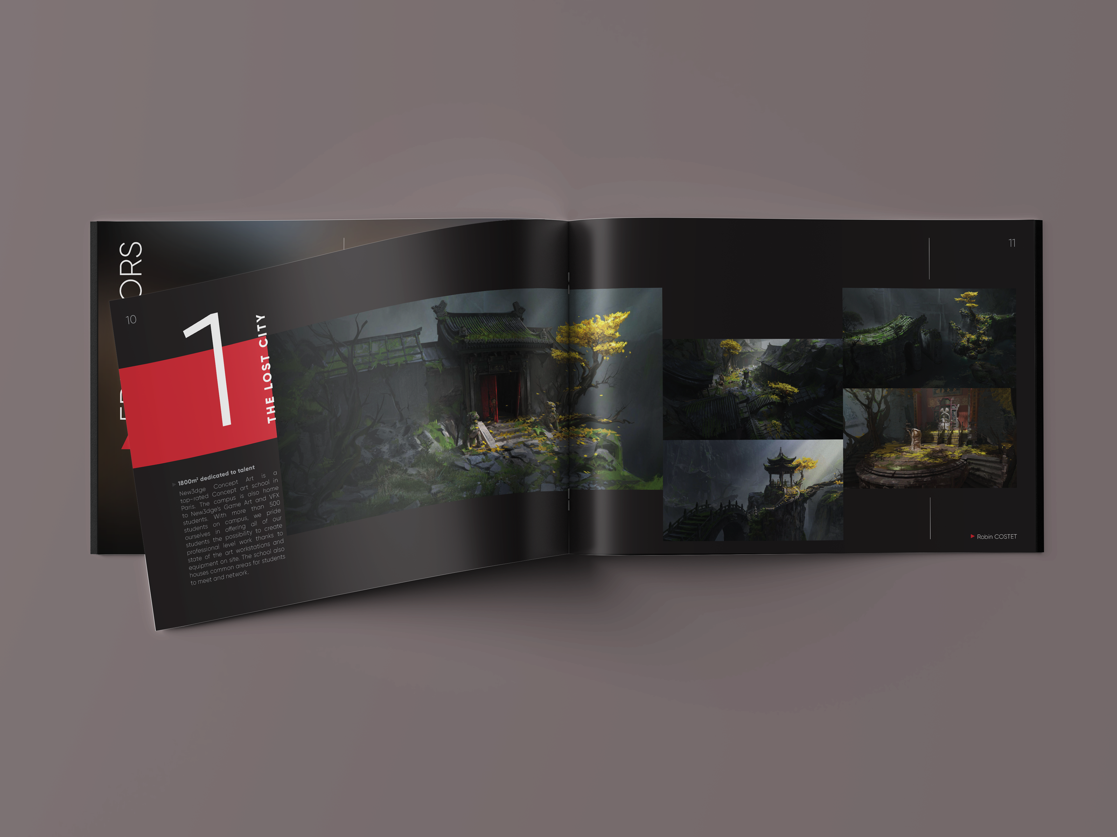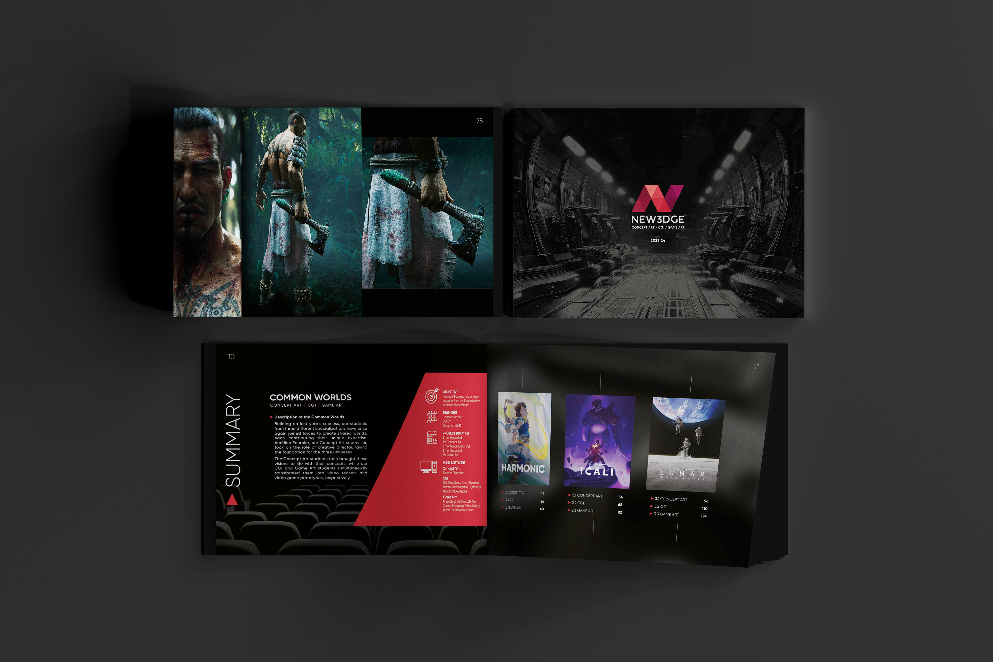 Création de one-pages ainsi qu'un artbook de présentation de projets communs de fin d'études pour l'école New3dge (Paris).